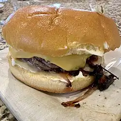 The burger is seared for a short time on the first side, and when flipped, the onions cook and caramelize.[7][1] Buns are untoasted and are steamed on top of the grilling burger before assembling the sandwich.[7] Garnishes include American cheese, pickles, and usually yellow mustard.