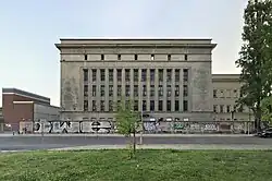 The most striking design feature of the boiler house and turbine and generator house is the elaborate historicizing architecture in the style of Socialist Classicism.[4] "The combined heat and power plant in Berlin-Friedrichshain, built in a style unusual for power plant buildings, is a classic example of the technical buildings designed in the Stalin era at the beginning of the 1950s."[5] Although the boiler house is a single large hall, from the outside it appears to be four or five storeys high. The large vertical windows seem to be interrupted by parapets. Behind the supposed parapets there are no floor ceilings, but an uninterrupted high space.[1] Both building sections are bracketed by a single very large articulated cornice. The facades are structured with pilasters. "Small mezzanine windows, kept in a strongly horizontal articulated cornice, gave the building the appearance of a Renaissance monument. The bunker-proportioned facades reflected the ‘new’ aesthetics of socialist realism."[1]