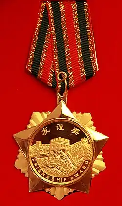 The Chinese Government's Friendship Award (simplified Chinese: 中国政府友谊奖; traditional Chinese: 中國政府友誼獎; pinyin: Zhōngguó Zhèngfǔ Yǒuyì Jiǎng; lit. 'Chinese Government's Friendship Award') is the People's Republic of China's highest award for "foreign experts who have made outstanding contributions to the country's economic and social progress".[1] The award was first established as the Medal of Sino-Soviet Friendship in 1951, when it was awarded to experts from the former Soviet Union and East European countries by the then premier Zhou Enlai and the foreign minister Chen Yi.[2] On September 15, 1955, the Chinese government decreed that each departing Soviet expert be issued a medal.[3] This medal featured the flags of China and the Soviet Union along with the inscription "Long live the Sino-Soviet Friendship" (Chinese: 中苏友谊万岁; pinyin: Zhōng–Sū Yǒuyì Wànsuì).[3] The friendship award was abolished with the Sino-Soviet split in the early 1960s. During the period that followed, in particular the Cultural Revolution, foreigners in China were often regarded as "spies" and very few remained in the country.[3]