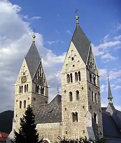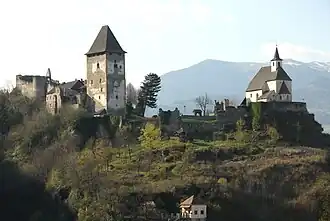 The settlement of Friesach beneath Petersberg Castle received town privileges in 1215. During the Middle Ages, it was a principal market town and commercial centre due to an important trade route from Vienna to Venice that ran through the city. The town flourished when Archbishop Eberhard II of Regensberg (1200-1246) made it the second largest city in the Archdiocese of Salzburg and the most important town in Carinthia. From local silver resources it even minted its own currency called the Friesacher Pfennig or Frizatik, widely used within the Austrian and Hungarian lands in the 12th century. The town gained in regional importance, and by the 13th century the Friesach pfennig was the standard coin used in the eastern Alps - circulated even as far as Croatia.[3] The importance of the town diminished with the rise of the House of Habsburg, Carinthian dukes since 1335. The fortress, however, continued to be an important power basis of the Salzburg prince-archbishops throughout the Middle Ages, once again enlarged and strengthened by Leonhard von Keutschach from 1495 onwards. It nevertheless belonged to Salzburg until the secularisation of the archbishopric in 1803, when Friesach finally fell to Carinthia.