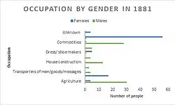 The 1881 occupational graph demonstrates that the most common occupations for men were in agriculture and commodities with approximately 30 men working in each of these occupations. The second most popular occupation was house construction with 9 men working in that occupation. Females occupations differ in comparison with 17 females employed in domestic services such as transporters of messages and 56 females without specified occupations suggesting they worked around their homes.[8]