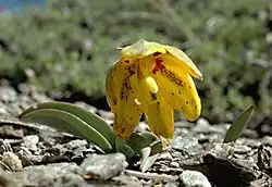 This uncommon wildflower has a short stem reaching 5โ20 cm (2.0โ7.9 in) tall and is surrounded by two to four thick, sickle-shaped leaves. It is sometimes stunted-looking with a curled or warped stem; it often grows in exposed mountainous areas. The flower is nodding and has six thick tepals 1โ2 cm long. They are yellow to purple and densely mottled. The fruits are winged.[6]