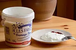 ![]() Fromage blanc served on a plate with jam, with its container | |