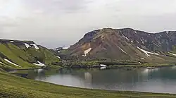 Evidence of volcanism shows around this lake; for example in the famous mixed lava flows from the 1477 combined eruptions of the Torfajökull and Bárðarbunga volcanic systems reaching down to the shore (lava flows of rhyolitic as well as basaltic composition).[2][3]