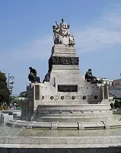 The work has a marble sculpture at the top, the work of the Italian sculptor Valmore Gemignani, with three characters that represent the fraternity of the human races, the white, the yellow and the black, for which it is also called the Fountain of the Three Races.[1] On the sides are two allegories that represent the Amazon and Yellow rivers, made in bronze by the sculptor Ettore Graziosi.[2] There are also four representations of the Raimondi Stele from the Chavín culture.[1]