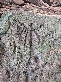 There are around 800 figures carved into the rock of the cave. Many are human figures, some of which have wings or horns.[1] The site has been dated to between 100 and 400 A.D., based on excavations and geological data.[1] The cave itself is around 7 metres (23 ft) deep and made of soft hyaloclastite, which is why the figures could be carved by abrasion and then polished.[1]
