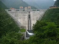 The Fukashiro Dam is a gravity dam in the Sagami River system, located 11 km (7 mi) north of Ōtsuki in Yamanashi Prefecture, Japan. The purpose of the dam is flood control and water supply. Plans for the dam were drawn up in 1978 and construction on the diversion tunnels began in 1996. The dam reached its height in 2001 and in 2003, the reservoir began to fill.[2] By 2004, the entire dam was complete. It is 87 m (285 ft) tall and 164 m (538 ft) long at the crest.[3] The dam's main spillway consists of five free overflow openings with a 790 m3/s (27,899 cu ft/s) discharge capacity. To handle additional discharges, there are two additional openings on the dam's orifice and two jet flow openings as part of the outlet works.[1]