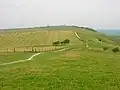 Fulking Hill (TQ 250 105) is the peak immediately west of Devil's Dyke. It also known as Fulking Tenantry Down as it is one of the three surviving Down pasture commons on the Brighton Downs. It had at least four prehistoric barrows, but only two are now visible above ground. One of them marks the southern end of the eastern boundary of the common and the other sits by the South Downs Way above the Fulking Hill western bostal.[12][13] That is a fine example, still with its flowery turf. On the western side of its dip slope, there was a working medieval strip cultivated open field until late 19th century. There were twenty three strips of around an acre each in size. The very tall old lynchets on the dip slope of these strips (TQ 246 103) are where the old Down pasture wildlife survives. There are bits of betony, rockrose and rampion, and in autumn there is scarlet hood, golden, and other waxcaps making splashes of colour.[26]