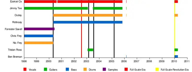 Full Scale were formed in 1998 in Perth as Full Scale Deflection. By 1999, they consisted of Ezekiel the Ox on lead vocals, Nic Frey on drums, Chris Frey on bass guitar, Forrester Savell on synthesiser, and Jimmy Tee on guitar. Matt Crute (aka Crutey) soon replaced Nic Frey on drums. Rob Kaay replaced Chris Frey on bass guitar by 2000.[1] They released the album, Symptoms of Chaos, on 11 November 2000. The band dropped the word Deflection from their name and then moved to Melbourne in 2001. Despite playing their original songs for some of their shows, they developed new music.
