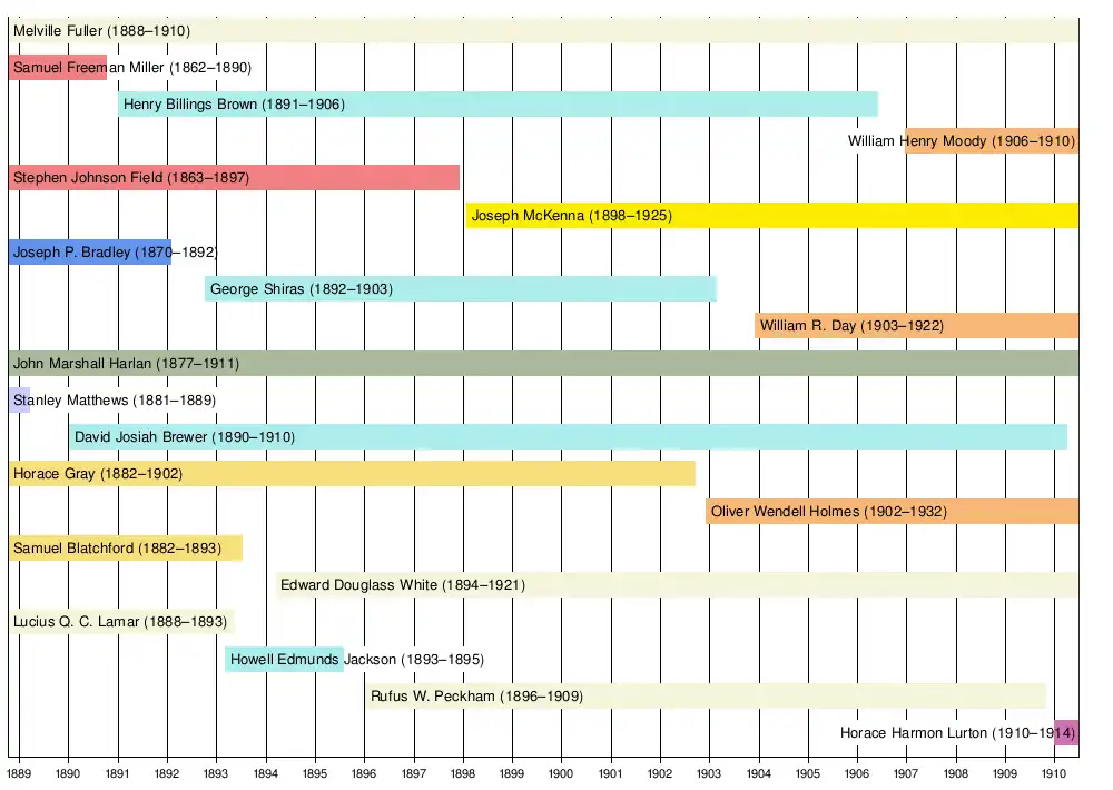 Field retired in 1897, and was replaced by Attorney General Joseph McKenna, the lone appointment made by William McKinley. Gray died in 1902 and Shiras retired in 1903; President Theodore Roosevelt successfully nominated Oliver Wendell Holmes Jr. and William R. Day to replace them. Brown retired in 1906, and Roosevelt appointed William Henry Moody to the court. Peckham died in 1909 and was succeeded by Horace Harmon Lurton, an appointee of President William Howard Taft.