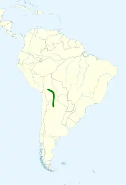 It is found in Bolivia and northwestern Argentina. Its natural habitats are subtropical or tropical moist montane forest and heavily degraded former forest.