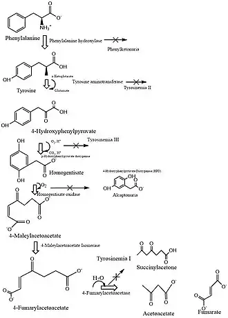 Possible disease symptom is the development of Hereditary tyrosinemia type 1 (HT1).[15] Caused by the lack of fumarylacetoacetate hydrolase (FAH), the last enzyme of the tyrosine catabolic pathway, HT 1 is inherited as a rare autosomal recessive disease with a prevalence in Europe of 1 : 50000.[15][18] However, in isolated parts of Quebec's provinces, the frequency can be as high as 1 : 2000 with a carrier rate of 1:20 possibly due to a single founder mutation.[5][17] FAH deficiency leads to an accumulation of alkylafing metabolites that cause damage to the liver. The disorder presents as an acute, chronic or intermediate mild phenotype. The acute form manifests itself within the first half year and is characterized by liver failure, renal damage, and possibly death in the first year of life.[20] The chronic form has an age of onset of more than one year after birth;[21] rickets and progressive liver disease often lead to the development of hepatocellular carcinoma.[18] Other symptoms can include renal tubular injury, hepatic necrosis, episodic weakness, seizures. Renal Fanconi syndrome and Porphyric crises are also cited in addition to liver and renal damage.[18]
