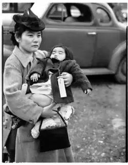 Fumiko Hayashida née Nishinaka (January 21, 1911 – November 2, 2014) was an American activist, originally from Bainbridge Island, Washington, who became one of the first Japanese Americans to be interned in March 1942. Hayashida was the subject of a Seattle Post-Intelligencer photograph which shows her, 31-years-old, holding her sleeping 13-month-old daughter, Natalie, while waiting to board a ferry from Bainbridge Island to the mainland with other Japanese American internees.[1] The photo became an iconic image of the plight of approximately 120,000 Japanese Americans who were interned during World War II following the signing of Executive Order 9066.[2] However, the identity of the woman in the photograph remained unknown for decades. She was known only as "Mystery Girl" or "Mystery Lady" until the 1990s, when researchers at the Smithsonian Institution uncovered her identity and tracked her down.