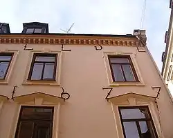 The façade of Number 5 (Deucalion 7), on the corner to Kornhamnstorg, got its present appearance in the 19th century, while the backyard is keeps its older look. On a painting from the 1790s the building appears with a stepped gable facing the square.[3]