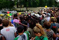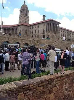 Mandela's body lay in state at the Union Buildings in Pretoria from 11 to 13 December 2013.[9] Approximately 100,000 mourners viewed Mandela's body over the three days. The crowds grew larger each day and thousands who queued on the final day could not be accommodated and were turned away.[26][27] Nelson Mandela's grandson, Mandla Mandela, remained with his grandfather's body for all three days, in accordance with AbaThembu tradition, which requires an adult male family member to remain with the body until burial.[28]