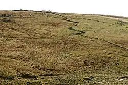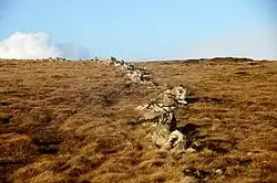 There are numerous old boundary dykes in Shetland and Funzie Girt is considered to be the best surviving example.[4][21] It both divides the island west to east and also marks an upland/lower land boundary, with the higher slopes of Vord Hill to the east of the dyke.[19] It is constructed from local stones with the largest slabs and boulders placed either on end or on edge and forming the base. The human effort required would have been considerable and suggests a relatively high Neolithic population for Shetland—perhaps as much as 10,000.[5][19] Although most likely built as a territorial boundary of some kind,[19] the original purpose of the dyke is not certain. In historic times it acted as a boundary marker or hagri, but its huge scale is difficult to reconcile with the available prehistoric human resources. It has been described as a "Bronze Age Berlin Wall",[11] which may have separated two competing tribes.[8][11]