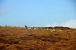 There are various other prehistoric ruins near the line of the wall, including the Bronze Age Hjaltadans stone circle north of Skutes Water, which is only 6 metres (20 ft) from the dyke, and the three stone circles of Fiddler's Crus to the north-west. There are also two Neolithic heel-shaped cairns, a style of chambered cairn unique to Shetland, near the summit of Vord Hill.[5][8][17][18]