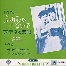 "Furimukanaide" (ふりむかないで; lit. "Don't Look Back") is a single by Japanese music duo The Peanuts. Composed by Hiroshi Miyagawa with lyrics by Tokiko Iwatani, the single was released on February 10, 1962, by King Records.[1] The song was written in the style of American pop music at the time. It stood out in the Japanese music scene, as it was an original composition in contrast to the "cover pops" that were translations of western pop songs. In addition, it was one of the earliest Japanese songs recorded in stereo. The Peanuts performed the song on the 13th Kōhaku Uta Gassen.[2]