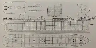 Her keel measured 14.5" x 10" American Rock Elm, Frames 4" x 3.5" x .5" in angle with reverse angles. Her frames spaced 18", Floors 18" x .5", keelson Plat 12" x .75", garboard strake 12" x 10" made of American rock elm. 5" to 4" plank in elm and teak, garboard to topside, with decks constructed of yellow pine.[2]