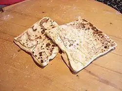 Gözleme is a savory Turkish stuffed turnover. The dough is usually unleavened, and made only with flour, salt and water, but gözleme can be made from yeast dough as well. It is similar to bazlama, but is lightly brushed with butter or oil, whereas bazlama is prepared without fat. The dough is rolled thin, then filled with various toppings, sealed, and cooked over a griddle. Gözleme may sometimes be made from prepackaged hand-rolled leaves of yufka dough.[1][2]
