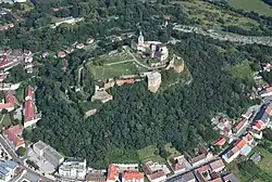 Wolfer, a German knight, who arrived to the Kingdom of Hungary during the reign of Géza II, founded a Benedictine monastery on the top of the mountain Güssing (or Küszén) in 1157. Contrary to the narrations of the medieval chronicles, he did not erect a wooden castle there; the establishing charter also emphasizes the mount of Küszén was an "uninhabited wasteland" before the erection of the abbey.[3] After a few decades of its operation, Béla III confiscated the abbey from the Benedictine friars and used the abbey's stone buildings to erect a royal castle (Novum Castrum or Újvár, "New Castle", later Németújvár, "German's New Castle", today Güssing Castle) on top of the hill around 1180. By that time, the tense relationship between Hungary and the Holy Roman Empire emerged, as Béla supported the papacy against Frederick I, Holy Roman Emperor during the Investiture Controversy. The Hungarian king also had conflicts over border disputes with the Duchy of Austria in the second half of the 1170s. Under such circumstances, the mountain of Küszén and its fortified abbey proved to be a strategic military site along the border with Austria.[4] The castle is first mentioned by contemporary records in 1198. According to historian Richárd Horváth, the castle was called Újvár, because the proximity of the castle of Pinkaóvár (or simply Óvár, "Old Castle", present-day part of Hannersdorf in Austria), which was the oldest motte-and-bailey castle in the region.[5]