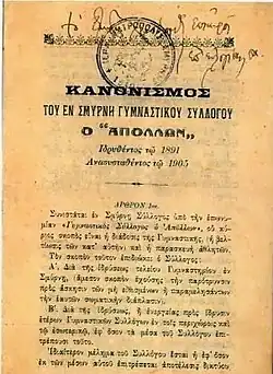 Apollon was founded in 1891 and was re-instated in 1905.[1][2] The first members from the club belonged earlier to Orpheas Smyrnis, the ancestor of Panionios. The metropolitan bishop of Smyrna Chrysostomos was among the founders of Apollon. In 1894, three years after its foundation, Apollon acquired its own stadium. A few years later the stadium moved in the Smyrni's district of Agios Tryfonas. In 1904, Apollon organised the Apollonian Games, the annual athletics games in Smyrna. Athletes of all the nations in Smyrna take part in the Games besides Turks.[1] The football team of Apollon was founded in 1910 and it became the most popular and successful team of the club.[1][2]