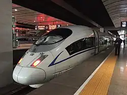 The G381/382 Beijing–Harbin through train (Chinese: G381/382次北京南到哈尔滨西高速动车组列车) is a Chinese railway running between the capital Beijing to Harbin, capital of Heilongjiang express passenger trains by the Beijing Railway Bureau, Harbin passenger segment responsible for passenger transport task, Harbin originating on the Beijing train. CRH380BG Type Passenger trains running along the Beijing–Shanghai High-Speed Railway, Tianjin–Qinhuangdao High-Speed Railway, Qinhuangdao–Shenyang High-Speed Railway and Harbin–Dalian High-Speed Railway across Heilongjiang, Jilin, Liaoning, Hebei, Tianjin, Beijing and other provinces and cities, the entire 1335 km. Beijing South railway station to Harbin West railway station running 7 hours and 8 minutes, use trips for G381; Harbin West railway station to Beijing South railway station to run 7 hours and 6 minutes, use trips for G382.