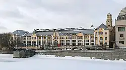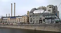 The tram power station is located on Bolotnaya Embankment and the long façade of the Engine Room overlooks the Moskva River channel. The building is a simple, airy structure, characterised by wide windows designed in the Russian Revival, typical of Vasily Bashkirov's last works – the facade of the Tretyakov Gallery made according to the sketches of Viktor Vasnetsov and Ivan Tsvetkov's private gallery on the Prechistenskaya embankment. The boiler house building which resembles a basilica, the front facade of which is underlined by a spacious arch, adjoins the engine room. Its roof was originally finished with a clock tower with a tent-shaped top, like that of the Spassky Tower of the Moscow Kremlin.[10] In the early 30s, when a famous House on the Embankment was completed, the top of the clock tower was dismantled.[11] In 1941, another historic element was lost. The station's giant brick pipes (over 60 meters tall) were dismantled over fears that the Germans would use them as a reference point in the air raids, and changed to steel pipes.[6]