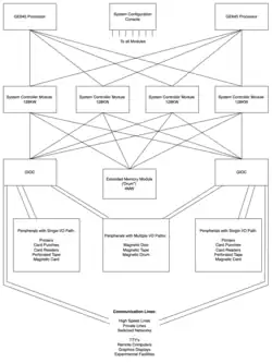 Compared to the rest of the 600 series the 645 did not use the standard IOC's (input/output controllers) for I/O. Nor did it use the DATANET-30 front end processor for communications. Instead both sets of functionality was combined into one unit called a GIOC (Generalized I/O Controller) which provided dedicated channels for both Peripheral (Disc/Tape) and Terminal I/O.[4][12] The GIOC acted as an Active Device and was directly connected to memory via dedicated links to each System Controller that was present in a specific configuration.
