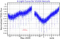 ![]() A light curve for V1434 Herculis, plotted from TESS data,[1] the 1.306 day interval between planet transits is shown in red. | |