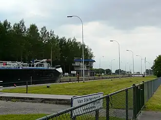 The new lock was built in a new about 1 km long side canal south of the 1864 lock. This canal was immediately constructed on the dimensions of the planned canal and had extra solid banks. The new lock had two connected lock chambers. The idea was that only the lower (eastern) one would be used regularly. In busy times, e.g. during the sugar beet harvest, the upper chamber would also be used, creating a single big lock chamber.[16] This could also be used for a tow of two 1,000t barges.[17] Effectively, the new lock could be used by 1,350t barges.[18]