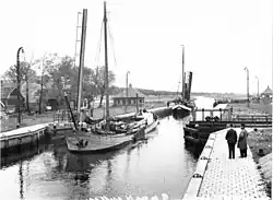 The effective opening of the Van Starkenborgh Canal was on 1 September 1937. Shortly after, sea-going ships appear in the lock's statistics. In February 1938 these were 21 ships totalling 2,528GRT.[38] After the Lemmer–Delfzijl Waterway was completed in 1951, it became popular for traffic between German North Sea harbors and the Ruhr. In 1957 2,281 mainly German coastal vessels passed the lock. Their average size was 154GRT.[39] The use of coastal ships on the canal later declined. In 1972, only 505 coasters averaging 220GRT passed the lock.[24]