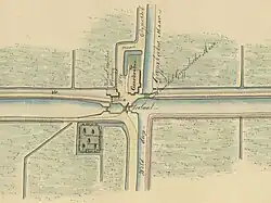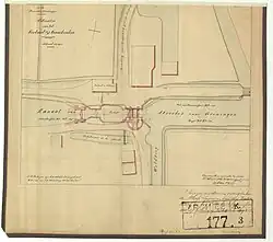 In 1806, Gaarkeuken Lock was renovated again. This time, a side canal was made to allow shipping to continue.[6] The design map of the 1864 lock shows the remains of this side canal. Maps made in 1818-1820 and in 1823 show this version of the lock. The more detailed 1823 map shows a very irregular kind of lock.[7] In 1843, the western gates and the masonry there were renewed.[8] This might explain the more regular form on the 1864 map and a map made in 1844.