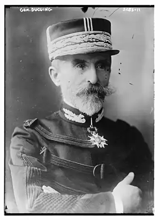 In September 1939, Ducuing took command of the battery of D.C.A. (défense contre aéronefs, or anti-aircraft group) of the Croix Faron at Toulon. At the end of January 1940, the French Admiralty was anxious to observe and maintain free passage along the Pas-de-Calais coast, and so set up a coastal battery at Cap Gris-Nez. Ducuing was charged with commanding and organizing this battery from March 1940. He had 3 officers and around 100 men under him, with only twenty rifles and six revolvers between them. On 22 May, facing the German offensive as it closed in on him, with the weak means at his disposal he organized an advanced position of 24 men of which he took personal command. When practically encircled, commandant Ducuing and his men completely destroyed a German column made up of a small number of side-cars, a light tank and two armored cars. In the evening, he refused a surrender proposed to him by the Germans. In the night of 23 to 24 May the French destroyer Chacal was crippled by German bombs and grounded nearby, with some of the wounded sailors joining Ducuing's group.
