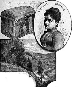 On January 22, 1890, Bompard herself appeared in the office with a middle aged man.[4] She was described as having dyed hair, grey-blue eyes, a large head, engaged expression, and short and strong body.[4] She came in wearing all black, gave her name when asked, and requested to be interviewed by the prefect of the jail.[4] Bompard, the man, and the prefect entered a private room, and Bompard told a version of the story in which she claimed to have been the unwilling accomplice of Eyraud.[4] She claimed he had done it without her present at No. 3 Rue Tronson-Ducoudray and had then told her about it before the two of them left together for the United States where Eyraud was still on the run.[4] She said they had encountered the man she was now with, and Eyraud had wanted to kill him too but she asked him to take her away, and the man suggested returning to France to give the police her story.[4] Bompard and the man apparently thought explaining her version would be enough to dispel suspicion, but the warrant was still out for Bompard and Eyraud's arrest, and she was taken to prison.[4] She was briefly depressed in prison but her spirits bounced back quickly.[4] Eyraud was at that time evading arrest in Mexico and then Havana where the international news coverage of the case's developments made staying ahead of the hunt for him easy.[4] During his time running he sent a letter to the French newspaper L’Intransigeant blaming Bompard and an unknown person for the murder.[4] He was eventually brought to French police on June 16, 1890.[4]