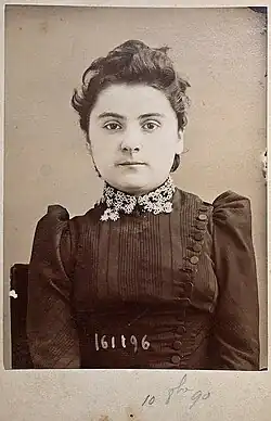 Gabrielle Bompard (born 1868) was a French murderess in the 1889 Gouffé Case who, conspiring with Michel Eyraud, was responsible for the homicide by strangulation of the bailiff Gouffé after luring him into her home, which fascinated the public and media in France and abroad due to her claim of being under hypnosis.[2][3][4] Bompard claimed that Eyraud had hypnotized her and therefore she should not be found guilty in Gouffé’s murder.[3] The credibility of this defense was heavily debated and the subject of conflicting expert testimony.[3] However, Bompard won the hypnosis argument, and while she was found guilty, she escaped full blame and the guillotine, instead receiving hard labor.[3][4] Bompard became a famous and popular figure in the fin-de-siècle during the murder trial due to the attention the case received in the press and how Bompard seemed to enjoy that attention and parade her newfound celebrity.[2][4]