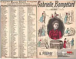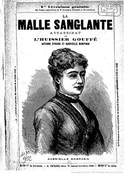 Bombard's celebrity created sympathy for her situation among the public, inspiring works such as a song and book about her.[11][9] Gabrielle Bompétard: Lament, the song, was inspired by the case and features Bompard on the scoresheet's cover.[11] "The Bloody Trunk: the murder of bailiff Gouffé, the Eyraud case and Gabrielle Bompard" by Jules de Grandpré, is a book detailing the case that was published in 1890 in Paris: the peak of Bompard's fame.[9] Bompard is illustrated alone on the cover, a rare aspect in the case's coverage which often features Bompard and Eyraud as a pair committing the murder, or depicts Gouffé. Little is known about Bompard's life after the Gouffé case or her death.