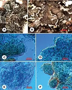 A–B macroscopic view of the thallus, with details of the wrinkled surface B and soredioid margin C–D cross section through the thallus, showing the cortex with small, isodiametric cells, and the Nostoc chains E surface view of the cortex F young goniocysts formed at the lobe margins.