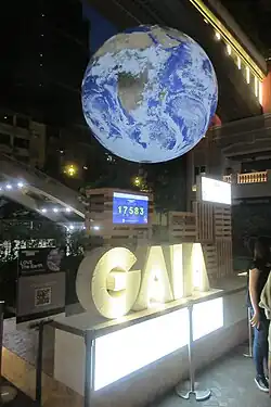 The sculpture is based on a helium balloon made by Cameron Balloons, covered with 50 panels of 120dpi printed imagery of the Earth's surface from multiple satellite images stitched together, at a scale of about 1:1,800,000, or 1 centimetre (0.39 in) to 18 kilometres (11 mi). The sphere is lit internally when installed in a dark place, to create a glowing floating orb. When viewed from a distance of 211 m (692 ft), Gaia is the same size as the Earth seen from the Moon.