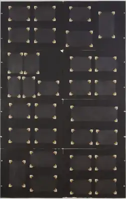 In the "Album" series (2008–10), Gregg channeled her own familial loss into drawings that explored abstraction and the power of visual autobiography by repurposing anonymous family photo albums and scrapbooks found at flea markets and junk shops.[23][5][38] She removed the snapshots, leaving life-worn pages with binder holes, intact photo corners and occasional captions—then filled in the negative space left by the photos with graphite or muted shades of pastel that suggested echoes of the absent originals.[5][38] ARTnews critic Doug McClemont wrote that the austere black, gray or brown grids "were as entrancing as they were melancholic—devoid of actual human presence, yet saturated with mystery" and capable of "excavating universal emotions—the pain of loss, the frustration of gaps in memory—from the layers of history of unseen individuals."[5]
