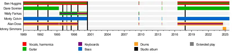 - Ben Huggins - lead vocals, guitar, blues harp (1989–2000, 2009, 2013, 2016–present)