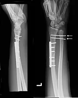| Galeazzi fracture. Arrow points at the dislocated ulnar head | |