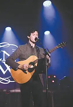 Most of Crew's catalogue has been co-written with legendary British songwriter Roger Cook. Crew's music often features whimsical themes and otherworldly elements drawn from fairy tales and fantasy to form modern parables in the form of song.[22] Crew has drawn great inspiration from the troubadours of medieval Europe who were often both knights and poets.[23] Crew's style is described as "a blend of pop and alternative with some electronic and folky elements."[20] Crew's musical influences include "the Beatles, Coldplay and John Mayer," and songwriting inspiration has been taken from mythical works and well-known fantasy authors such as J.R.R. Tolkien, C.S. Lewis, and Hermann Hesse.[20] As a tribute to his success in China, Crew prominently featured the erhu, a traditional Chinese stringed instrument, in the single "Fragrance."[19][20] The music video for the single also contains shots of Shanghai, Chinese scenery, and everyday life in China.[24] In 2022, Crew released a song written in Mandarin Chinese entitled I Know Your Name.[25]