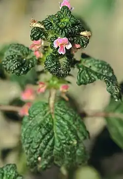 Like other Lamiaceae, its corolla is bilabiate meaning that it has two lips, an upper lip and a lower lip. The upper lip has one lobe and the lower lip has three lobes covered with hair on the lower side of the lobe. The flowers are bell shaped and bilaterally symmetrical, ranging in size from about one half to three fourths of an inch. The pistil consists of two fused carpels; its stigma is two-lobed. There are four stamens, two long and two short. Its style is solitary. Its flowering time is late summer to autumn. Its fruit is a schizocarp, brown in color.[2] This plant is self-pollinated, each plant with a capacity of producing up to 2,800 seeds which can remain dormant under soil for several years. The seeds are large; dispersal is via mammal fur. Germination occurs when the seeds are brought near to the soil surface[3] and it takes place within a month.[2]