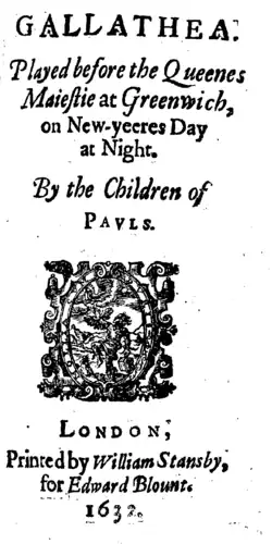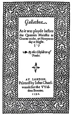 A play titled Titirus and Galathea was entered into the Stationers' Register on 1 April 1585. Some scholars have speculated that this play, otherwise unknown, may have been an early version of Lyly's work – though the point is open to doubt, since what clearly was Lyly's play was entered into the Register on 4 October 1591, along with his Endymion and Midas. Gallathea was acted at the royal palace at Greenwich before Queen Elizabeth I by the Children of Paul's, most likely on 1 January 1588 (new style).[1] Gallathea was first printed in 1592, in a quarto printed by John Charlwood for Joan Broome (the widow of bookseller William Broome, who had published reprints of Lyly's Campaspe and Sapho and Phao in 1591). Gallathea was next printed in Six Court Comedies (1632), the first collected edition of Lyly's works.[2]