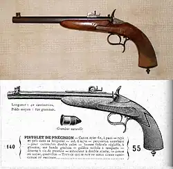 A gallery gun, Flobert gun, parlor gun or saloon gun is a type of firearm designed for recreational indoor target shooting.[1][2] These guns were developed in 1845, when French inventor Louis-Nicolas Flobert created the first rimfire metallic cartridge by modifying a percussion cap to hold a small lead bullet. In the 19th century, gallery guns were typically pump-action rifles chambered in .22 Short.[3] Gallery guns are still manufactured, although by the late 20th century, they have been eclipsed by airguns for the purpose of indoor shooting.[4]
