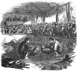 Cock-fighting is a sport wherein 2 cocks that have been carefully bred and specially fed wrestle each other inside cockpit arenas until one dies or is unable to go on and the people bet their money on which cock will win. Most cockpits have a maximum of 10 minutes of fighting time. The victorious cock gets treatment and medicine after the fight and gets a break of around 3 to 5 months before fighting again while the losing cock which is dead is usually consumed by either the winning owner of the cock as a prize, or by other people.[26][27]