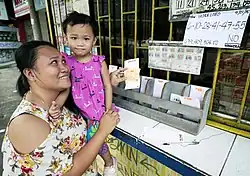 Jueteng is an illegal numbers game that is a form of local lottery and is popular in the country due to its nature. The game was probably introduced during the Spanish colonization, and like cockfighting, it was done so by Chinese entrepreneurs.[28] The name itself comes from the Chinese characters hue, meaning flower, and teng meaning to bet. It involves the combination of 37 numbers against 37 numbers, (38 numbers in some areas), numbered 1 to 37, and bets are placed and accepted per combination.[29] The game is usually played by choosing a combination of two numbers from 1 to 37, then little numbered balls (bolitas) are shaken in a basket (usually a rattan basket) and two balls are drawn before witnesses.[28]