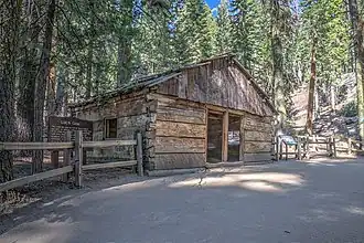 After the establishment of General Grant (now Kings Canyon) National Park in 1890, the United States Cavalry used it for hay and grain storage from 1891 to 1901.[1][2] It later became the living area of the first civilian park ranger, Lewis L. Davis, between 1902 and 1909. There, Davis learned about the sequoia's relationship with fire and raised young plants.[3] During the winter of 1931–32, a falling tree damaged the roof. Due to the building's age, plans were made to reconstruct it, with the restoration happening in 1933.[1]