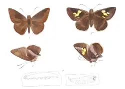"The patch of setae on the upperside of the anterior wings, the yellow tuft (which probably serves as a scent-fan) on the underside of the same wings, and the lines of modified scales (which probably cover the scent glands as they seem soiled as if by some exuding fluid) on the upperside of the posterior wings are structures peculiar to the male sex." (Wood-Mason and de Niceville, I. c.)